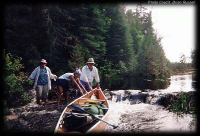 Dottie Anderson, Angie, and Skip Guyer crossing beaver dam exiting Fran Lake. 1999. Angie is the hitch hiker we picked up after her party left her behind. Next Image