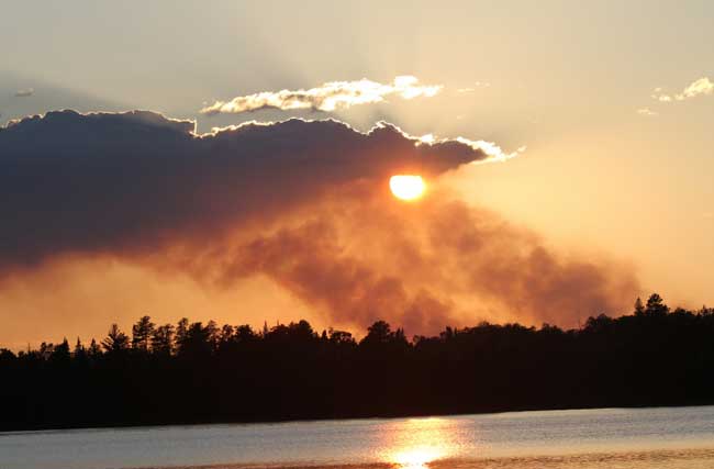Smoky sunset on Kawishiwi Lake, smoke from Pagami Creek fire, September 9, 2011